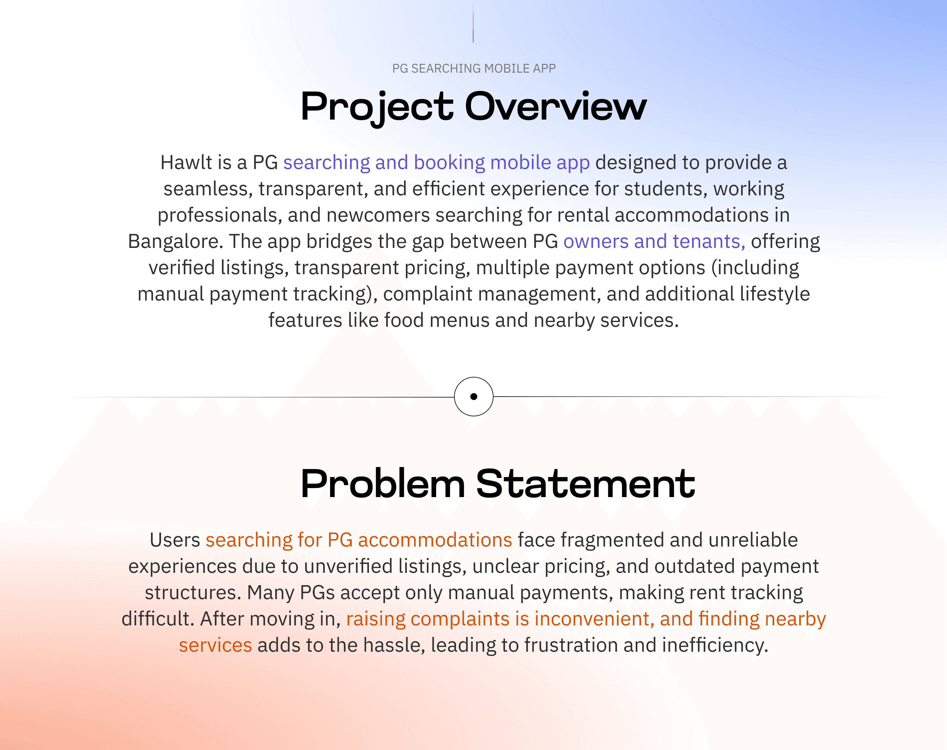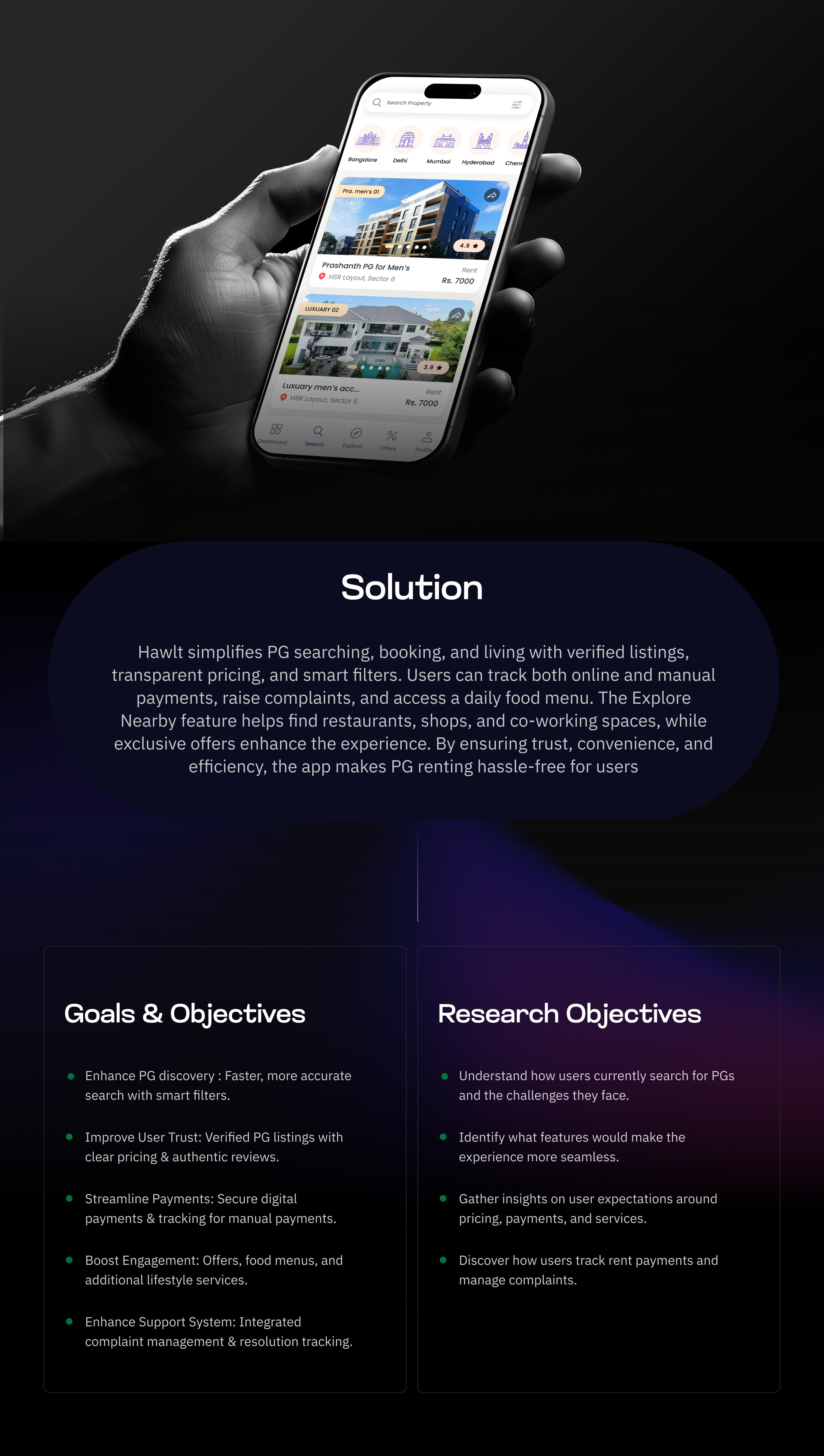 Hawlt is a PG searching and booking mobile app designed to provide a seamless, transparent, and efficient experience for students, working professionals, and newcomers searching for rental accommodations in Bangalore. The app bridges the gap between PG owners and tenants, offering verified listings, transparent pricing, multiple payment options (including manual payment tracking), complaint management, and additional lifestyle features like food menus and nearby services.